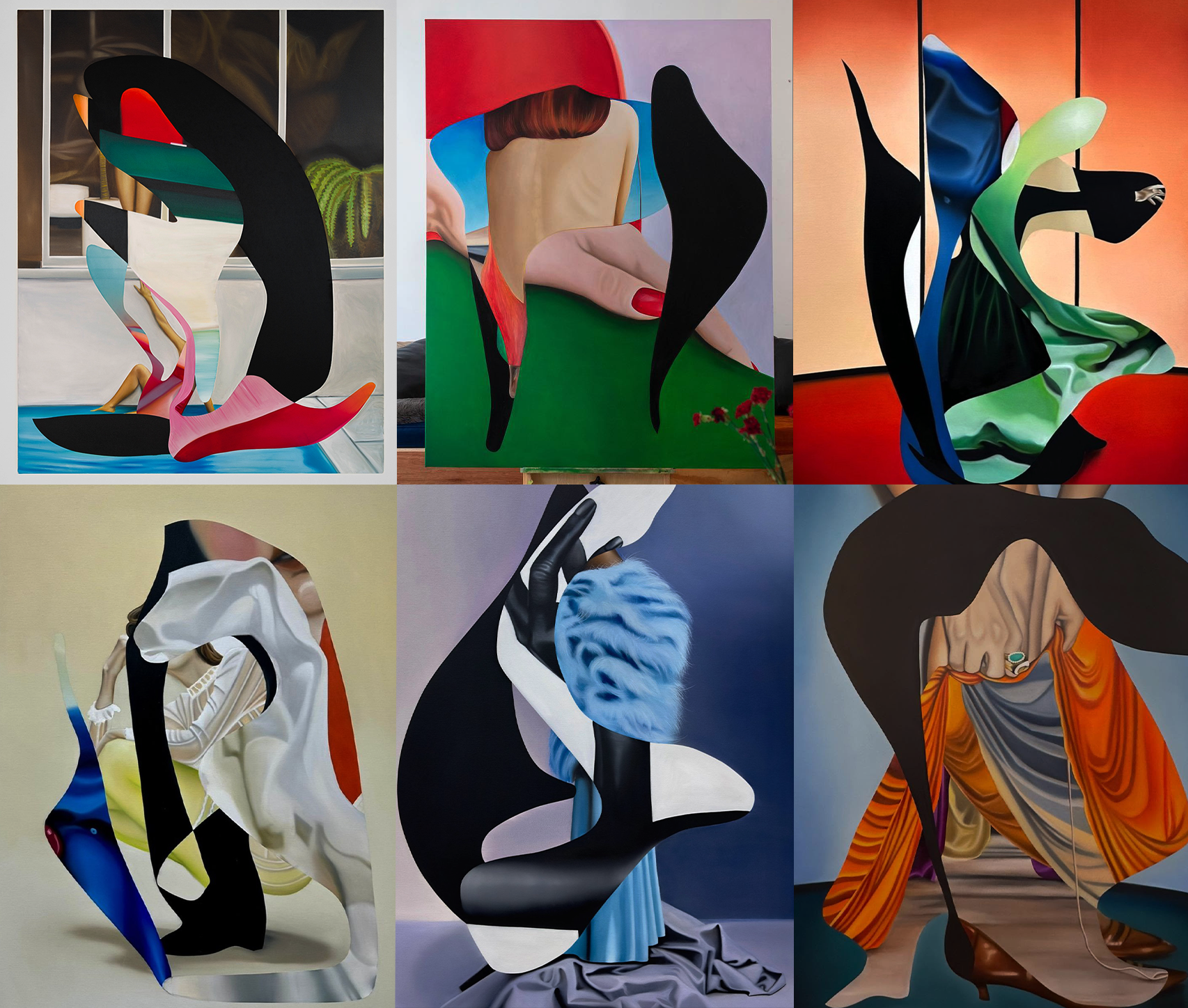 There is a refreshing fluidity to her work—an effortless ability to seamlessly layer morphed faces, textures, landscapes, and body parts overlapping each other creates a compelling collage composition that makes me want to linger. I love the sharp edges and fragmented forms intertwining. Each component feels like it belongs. There is a beautiful cohesiveness to her paintings. The openings in her work feel like portals, and it makes me want to physically step into her world and lose myself. Melissa’s paintings remix identities, places, dreams, abstract shapes, and surrealism that make you pause and reflect. Her colour pairings are also a divine, visual treat that I’d like to indulge in.